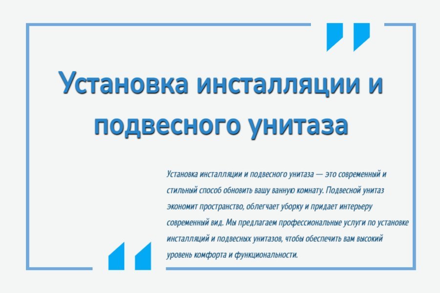 - Аккуратность и внимание к деталям: Мы тщательно выполняем все работы, чтобы инсталляция и подвесной унитаз были установлены ровно и надежно, обеспечивая долгосрочную эксплуатацию.